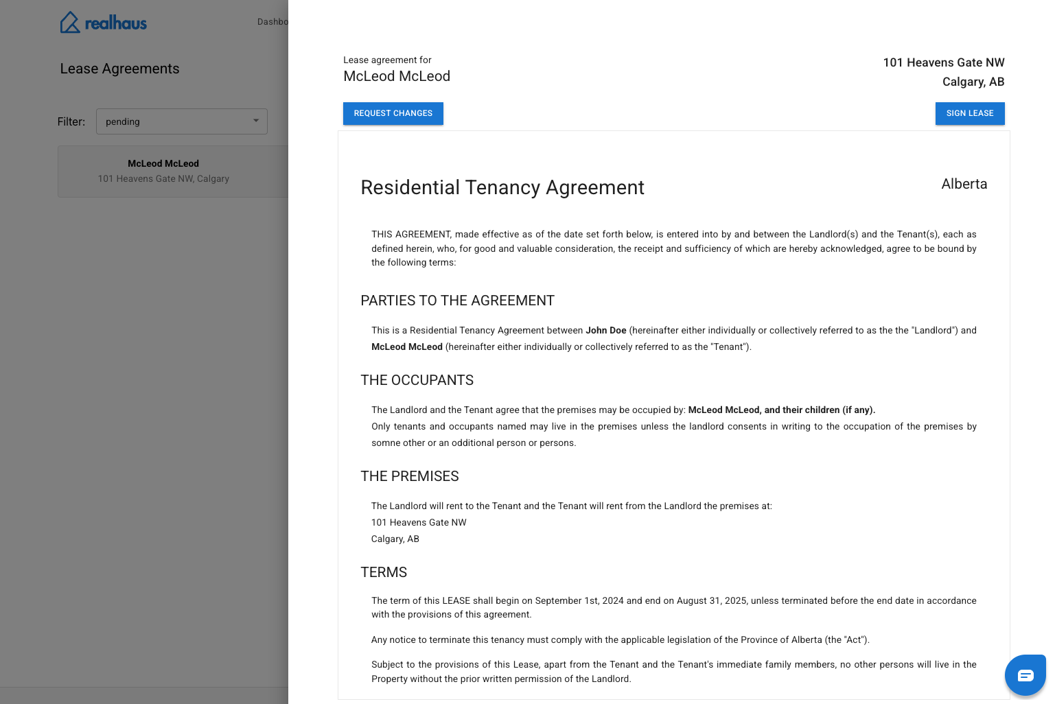 If something doesn’t match what you agreed upon, Realhaus gives you a simple way to raise it. At the top of the lease screen, click the Request Changes button.