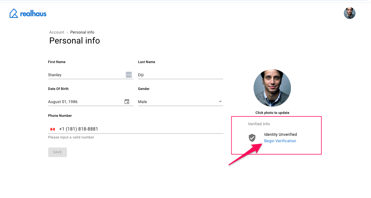 To begin the identity verification, visit the personal info page at app.realhaus.ca/account/personal-info and complete the form fields. Save the form once you have completed all fields.